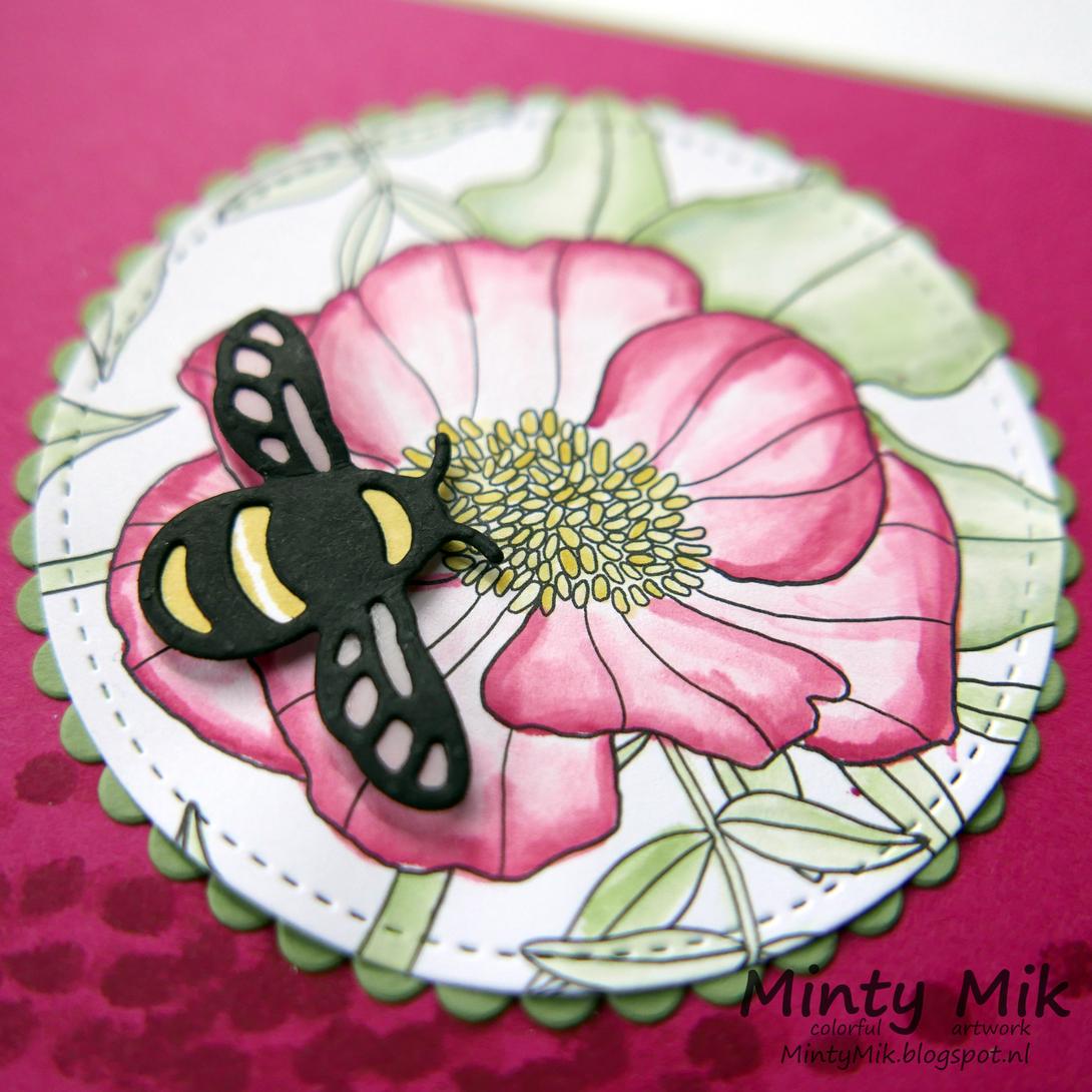 De bij is gemaakt door de bij uit de Detailed Dragonfly Thinlits Dies set uit te stansen uit Basic Black cardstock. Ik plakte stukjes vellum achter de vleugels. Het lijfje is gemaakt door de bij te stempelen met So Saffron inkt op Whisper White en dan uit te knippen zonder de vleugels en achter het Basic Black lijfje te plakken.