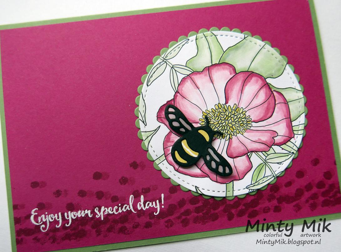 Series Paper en de Dragonfly Dreams bundel. I heb een cirkel uitgestanst en ingekleurd met een blender pen en So Saffron, Rose Red en Wild Wasabi inkt. De stipjes heb ik met Rose Red inkt op Rose Red cardstock twee keer gestempeld zonder tussendoor te beïnkten en half over elkaar zodat er een schaduw ontstaat.