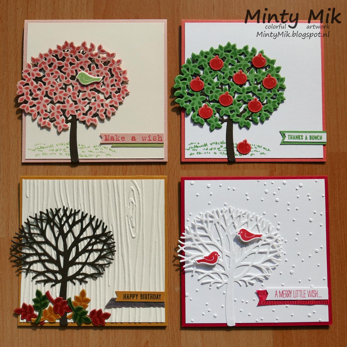 Met de Thoughtful Branches bundel kun je heel verschillende kaarten maken. Ik maakte er al een kerstkaart en een kaart met blauwe druifjes mee en ook op mijn facebook pagina liet ik al wat voorbeeldjes zien. Dit keer heb ik met de boom en blaadjes stans de vier seizoenen gemaakt.