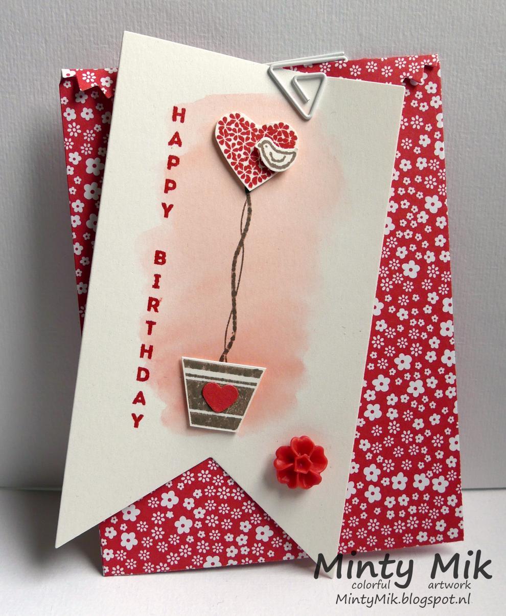 De achtergrond bloem heb ik gemaakt met de grote bloem stempel in doosje 1 van 2. Ik heb de bloem beïnkt met sponge daubers. Het hartje is met Smoky Slate gedaan en daar omheen heb ik Flirty Flamingo aangebracht. Over deze bloem heb ik gestempeld met Island Indigo inkt met de bloem stempel uit doosje 2 van 2.